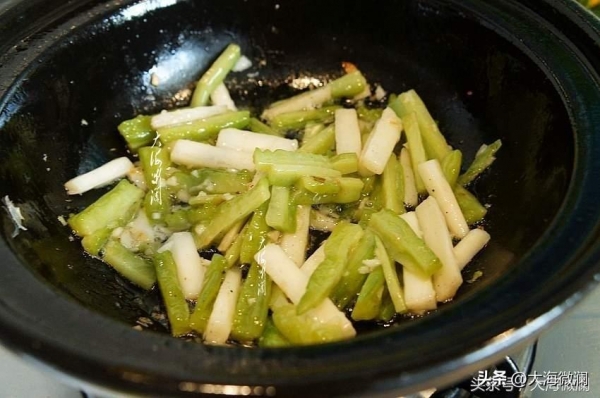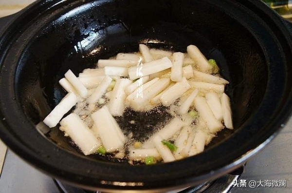 砂锅加入适量的油,爆香五香粉和葱、蒜末,加入山药条翻炒,少许淋点水促进快熟。