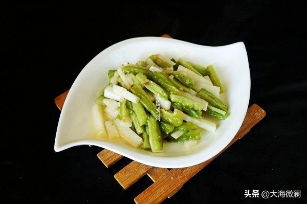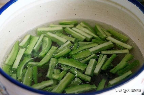 做法:苦瓜在淡盐水中浸泡几分钟,用软刷子反复刷洗表面,再清洗干净,去掉瓜瓤,切条。锅中水开,滴几滴食用油,加一小勺盐,下入苦瓜条焯水,捞出过冷水控净水分。