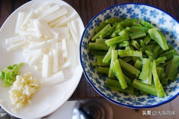 食材:苦瓜1根;山药半根;油、盐、五香粉、蒜、水淀粉各适量。