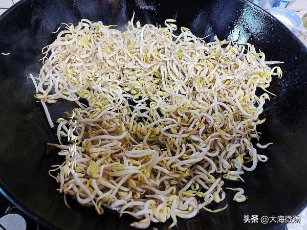 起油锅爆香花椒粒取出扔掉,然后爆香葱花,下入豆芽大火快速翻炒两下。