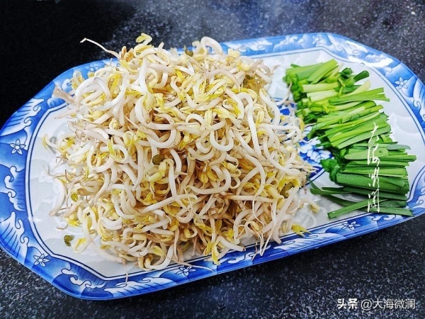 做法:绿豆芽清洗干净,韭菜在淡盐水中浸泡10分钟左右,再反复清洗干净,切段。