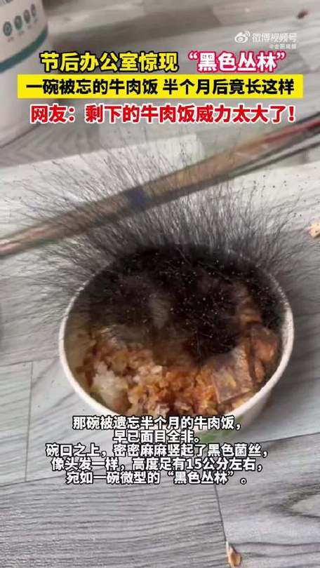 循着味道找去,眼前的一幕让他惊呆了:那碗被遗忘半个月的牛肉饭,早已面目全非。碗口之上,密密麻麻竖起了黑色菌丝,像头发一样,高度约15公分,宛如一碗微型的"黑色丛林"。