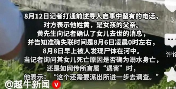 父亲被告知女儿准确的失联时间是8月6日零时许,8月8日早上的时候女儿的尸体在河道中被人发现。
