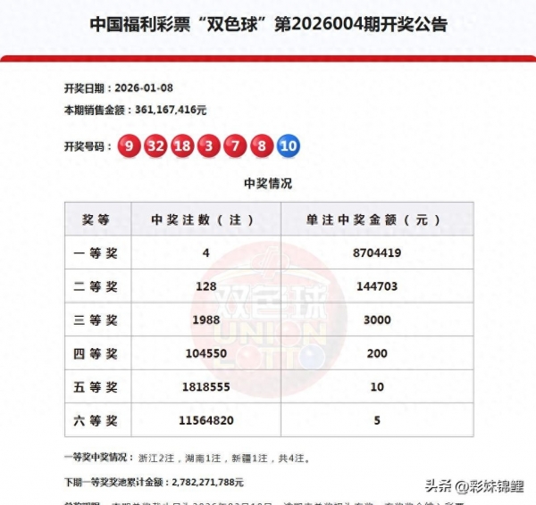 今天1月8日,星期四,晚上双色球26004期开奖出炉了。