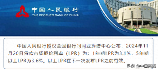 11月20日,中国人民银行授权全国银行间同业拆借中心公布,2024年11月20日贷款市场报价利率(LPR)为:1年期LPR为3.1%,5年期以上LPR为3.6%,均较上月维持不变。