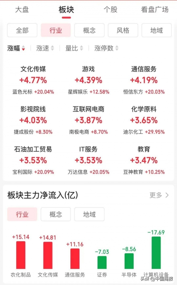 截至中午收盘,上证指数涨0.55%,深证成指涨0.77%,创业板指涨0.59%。互联网、文化传媒、造纸、医药等板块涨幅居前。