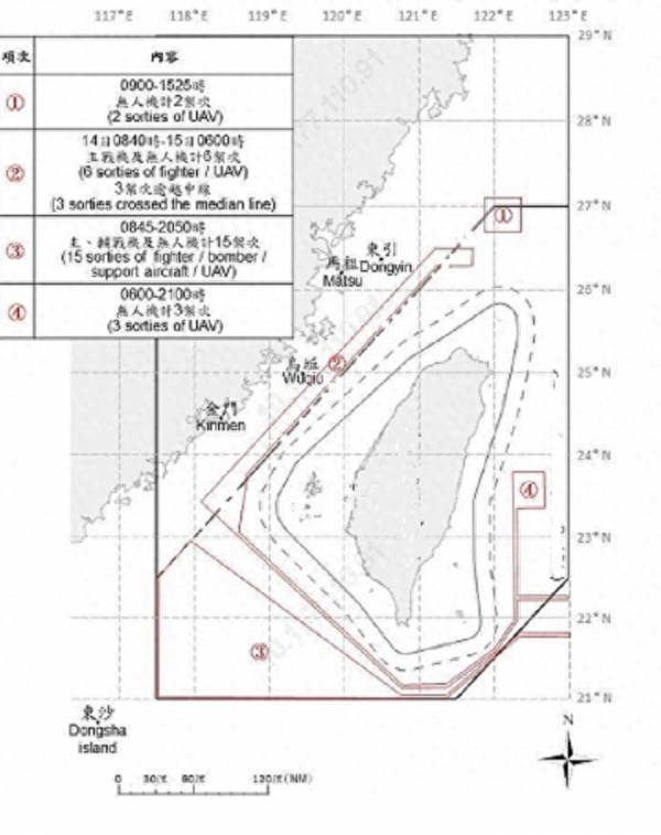 据台军方消息来源,截至9月15日上午6时之前24小时,解放军26架次(其中23架次跨越所谓"中线"),进入台岛北部、西南及东部空域活动,另外还有9艘军舰、1艘公务船。呈现出四面"围台"、重点迫近的军事态势。