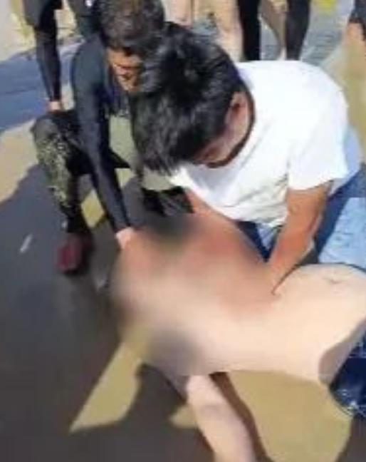 △万宁蓝天救援队队员等好心人正在接力对吴秋钟实施心肺复苏。(视频截图)