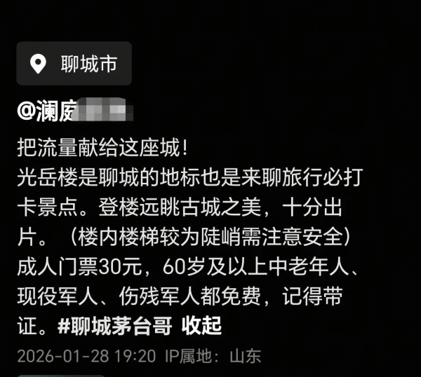 1月28日晚上7点多,大嫂又发了一个作品,把流量献给这座城,介绍聊城的地标建筑光岳楼。
