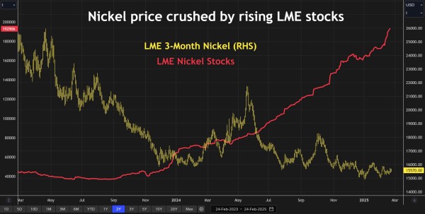 文章称,印尼镍产量激增,导致全球镍价格暴跌,伦敦金属交易所镍价已暴跌至每吨1.6万美元以下。