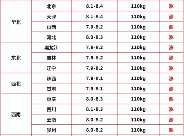 华北地区:河北上涨0.1元/斤,标猪出栏参考价8.0~8.3元/斤。