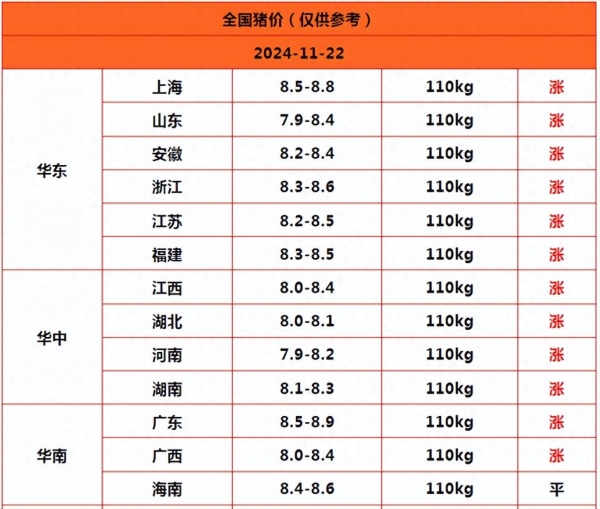 明天是2024年11月22日,牛气冲天!猪价继续一片红。从明日猪价预测来看,全国猪价1地平稳,25地上涨,0地下跌,猪价继续上涨。
