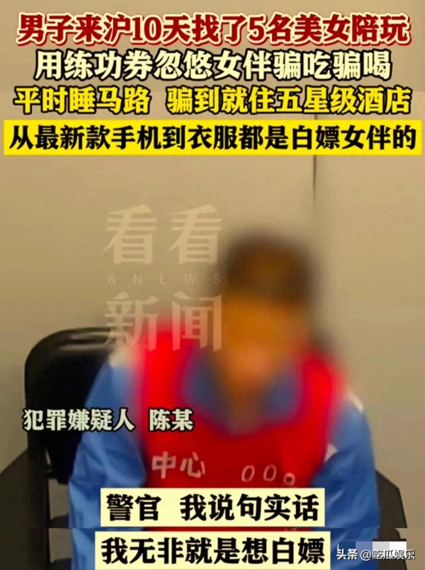 8月19日,警方在上海某区域将陈某抓获。被抓时,他身上穿的名牌衣服、手里拿的最新款手机,全都是被害人买的,而他口袋里除了几张零钱,连一点像样的财物都没有。面对警方的审讯,陈某倒是很"坦诚",直言不讳地说自己就是想白嫖,不想花一分钱享受高端生活。