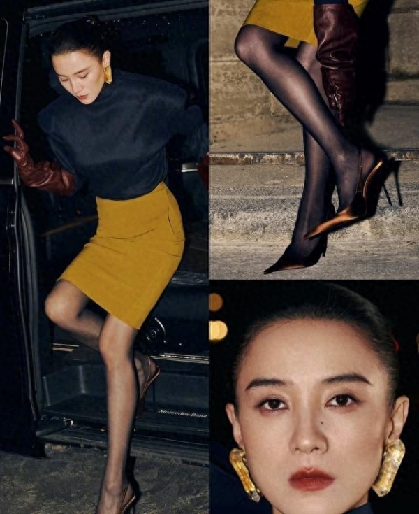 耳朵上的挂饰也很亮,像金色的花生。有的人专门拍她的耳饰,说是精致。衣服颜色分两块:上边的衣服是黑色的,领子高,下边裙子是土色的,裙子和鞋子搭配了,鞋子尖尖的。