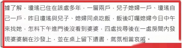 她的儿子说,当时母亲留下了遗书,中午让秘书回去看看,没想到进去屋内后就发现人已经不在了!