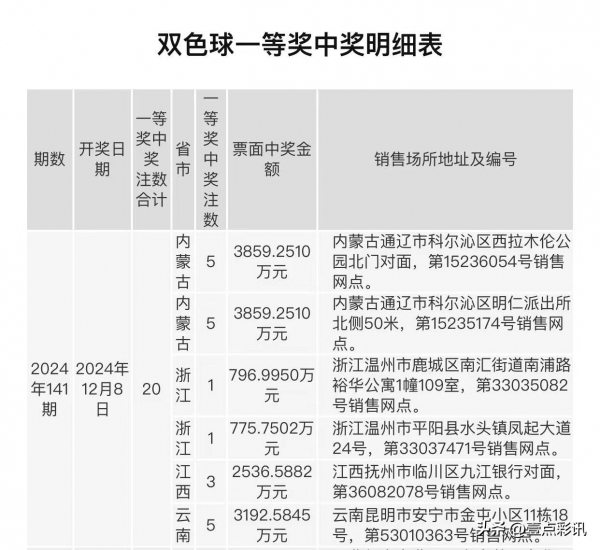 双色球24109期开出20注一等奖,分落4地,每注奖金638万。