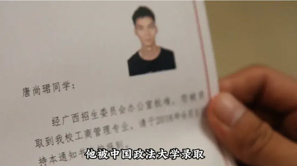 接下来的2015年,唐尚珺又被吉林大学录取,但因为专业被调剂,他又继续复读,直到2016年他被中国政法大学录取,但此时噩耗传来,他的父亲因常年劳累患上肺癌时日不多,他决定在父亲有生之年把自己隐藏多年的秘密告诉他,躺在病床上的父亲看着中国政法大学的录取通知书,不但没有埋怨儿子,反而还感到自豪。