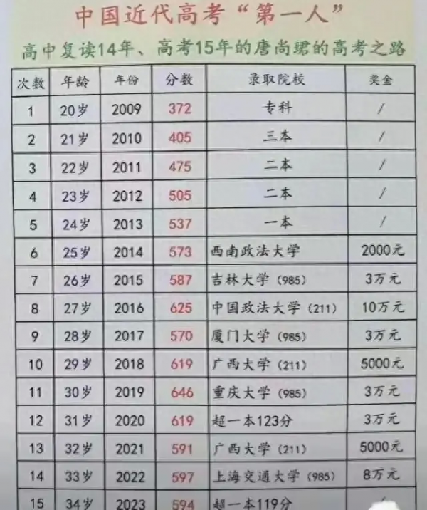 唐尚珺是中国高考总得分王,从20岁考到35岁,不仅总分近万分,还共获奖励近30万,他每年都考上958/211大学,但他却一次次坚持复读,有人说他是为了拿奖金的职业高考人,还挤占别人读大学的名额,也有人敬佩他的勇气。