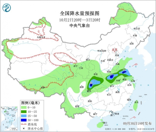 9月30日20时至10月1日20时,新疆北疆北部、青海东部、甘肃南部、宁夏南部、陕西中南部、四川东北部、重庆北部、河北西北部、河南中西部、贵州西南部、广西西部、云南大部等地部分地区有中到大雨,其中,甘肃南部、陕西南部、四川东北部、河南中西部、云南中西部等地部分地区有暴雨,局地大暴雨(100~120毫米);新疆北部阿勒泰高海拔地区有中到大雪或雨夹雪,局地暴雪。新疆北疆北部、内蒙古中东部、黑龙江北部、辽东半岛、山东半岛等地部分地区有4~6级风;东海北部海域将有5~7级、阵风8级的大风(见图3)。