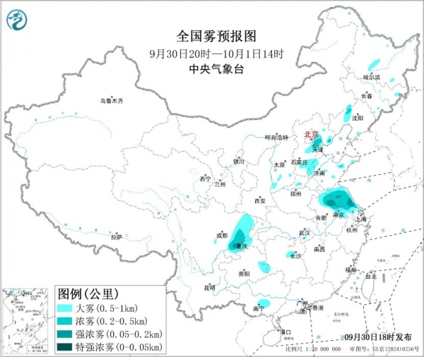 预计,9月30日夜间至10月1日上午,北京东部、天津、河北中南部、山东西北部、江苏、安徽东北部、四川盆地东部、重庆西南部等地的部分地区有大雾,局地有能见度低于200米的强浓雾。中央气象台9月30日18时发布大雾黄色预警。