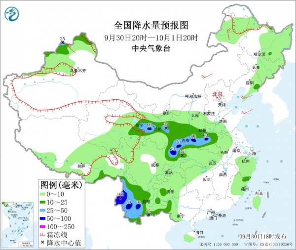 预计,9月30日夜间至10月5日,华西地区、黄淮等地多降雨,青海东部、甘肃东部、陕西中南部、四川东部、重庆西部和北部、湖北西部、河南、山东中南部、苏皖中北部等地将有中到大雨,局地有暴雨或大暴雨。