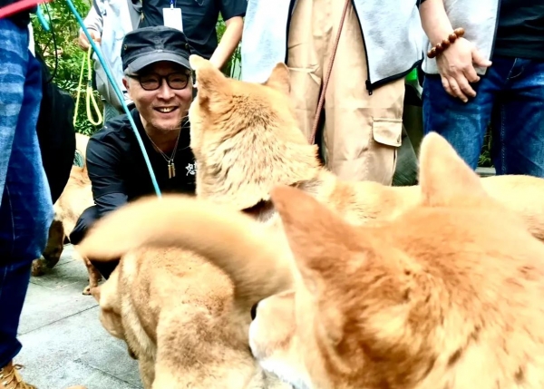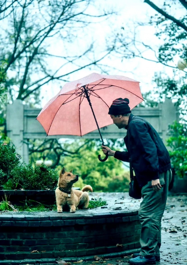 两只狗陪伴了他很长的时间,他回去了会和妻子一起出去遛狗,看见了其他小狗走到了他脚步绕圈了,他看见了也不赶走,而是弯下腰来摸摸小狗圆圆的脑袋。