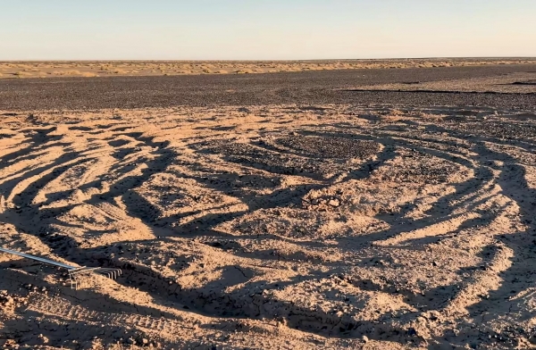 从卫星图和现场照片能看出,"人民" 两个字中间的车辙印形状很特别,是那种典型的 "8 字型" 闭合漂移痕迹,好几道车辙印都叠在了一起,有的深有的浅,这说明不是一辆车开过去一次就成这样的,而是很多次反复压出来的。而且现场还有宽窄不一样的轮胎印,能看出是至少两种不同得车型留下的。