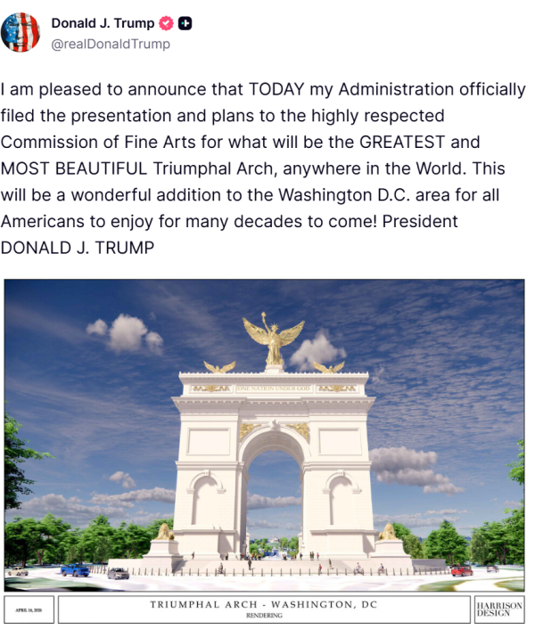 特朗普吹嘘说,这会是"一座全球范围内最伟大、最美丽的凯旋门","将为华盛顿特区增添一处绝佳景观,供全体美国人民在未来数十年间尽情欣赏!"