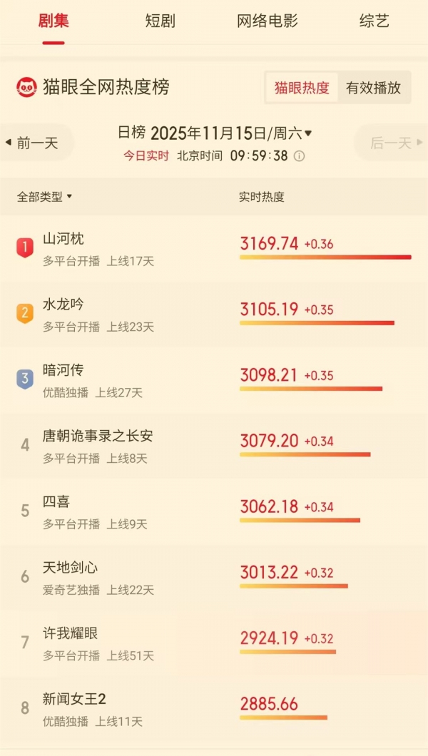 再说播出平台之外的数据情况。猫眼专业版,是很多业内朋友经常参考的数据平台。在这个平台上,11月15日上午,《唐朝诡事录之长安》的热度排名,只是第四,连前三都没有进去。猫眼专业版上的热度,综合了播出数据、网络热度等等。它的数据,也只是当作一种参考罢了,不能视其为唯一排名参考。