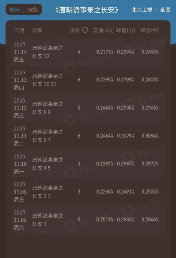 目前,数据上人为操作非常困难的,则是收视率。电视剧《唐朝诡事录之长安》正在北京卫视播出状态,我们不妨对它的收视率情况进行一下观察。而观察收视率,有两个平台数据值得参考。一个是酷云,它可以开出实时的数据。一个是总局的中国视听大数据,这个,非常权威,业内基本上都拿这个当长期参考数据。