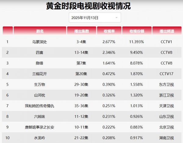 在总局的中国视听大数据上,也可以管中窥豹了。目前,中国视听大数据上开出的离我们最近的一天的收视率,是11月13日的。《四喜》高达2.346%,而北京卫视的《唐朝诡事录之长安》则只有0.222%,排名第九。