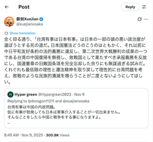 中国驻日大使馆和驻大阪总领事纷纷在社交媒体上对高市早苗的这番挑衅性言论进行了猛烈批判,要求高市早苗必须解释清楚。中国外交部发言人林剑对此回应,日本首相必须在台海问题上有着清醒认知,人们必须反思历史上的错误,不要再妄图用不切实际的幻想来挑衅中国。