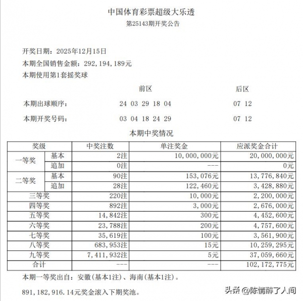 本期大乐透开出2 注一等奖,花落 2地,每注 1000万,一等奖出自安徽(基本1注)、海南(基本1注)。 。 二等奖 90注,每注奖金15.3 万!三等奖 220注,每注10000 元。。