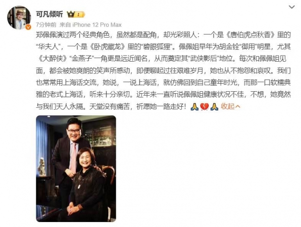 随后,多位影视圈人士发文称,郑佩佩已病逝,包括著名的上海主持人曹可凡。