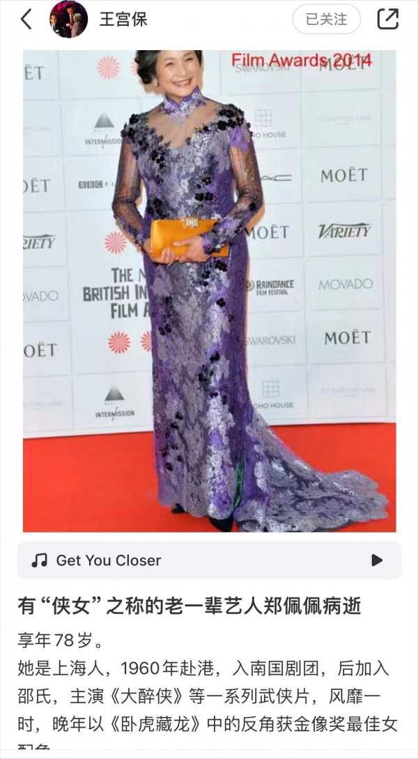 有"侠女"之称的老一辈艺人郑佩佩病逝,享年78岁。她是上海人,1960年赴港,加入南国剧团,后加入邵氏,主演《大醉侠》等一系列武侠片,风靡一时,2001年以《卧虎藏龙》中的反派角色获金像奖最佳女配角。