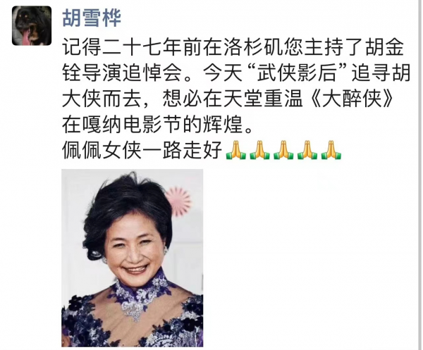 另外,网上也流传一张截图,那是导演胡雪桦的朋友圈,他发文悼念郑佩佩。