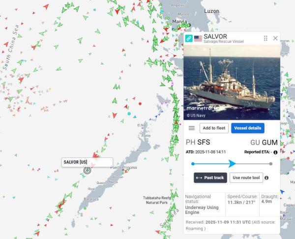 根据公开的船舶AIS信息追踪网站显示,"救助者"号曾在11月9日出现在巴拉望岛以西的南海海面上,尽管此前曾有公开信息称其于11月8日从菲律宾出发前往关岛,但目前其具体位置则尚不明确。