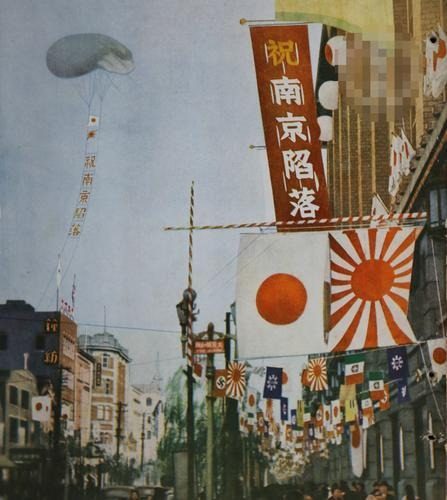 照片拍摄地是东京银座,街头彩旗飞舞,高挂"祝南京陷落"的庆祝标语和日本军国主义的太阳旗和军旗。不仅如此,银座的街头还到处挂着德国法西斯和意大利法西斯的旗帜,法西斯的旗帜与日本军国主义的旗帜并挂一起,向日本国民宣示,攻占南京是国际法西斯势力的共同胜利。