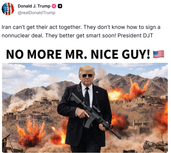 特朗普同时发布一张图片,内容是疑似用AI生成的本人持枪造型,配有文字"再也没有好好先生"。