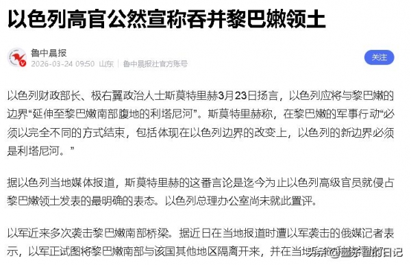 以色列高官公然宣称吞并黎巴嫩,这种做法完全违背了国际准则和领土完整的基本原则,只会进一步激化双方的矛盾,让原本就紧张的局势彻底走向失控,而最终受苦的只会是两国的普通民众。