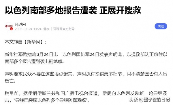 另一边,以色列南部的局势同样不容乐观,3月24日以色列国防军正式发布声明,宣布南部多个地区报告遭遇袭击。