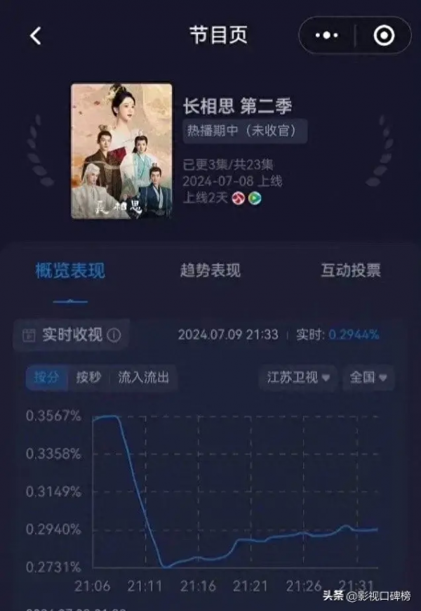 江苏卫视收视只有0.3,平台数据还没有破30000,不算出色,最明显的应该看广告的反应,现在最新集广告已掉至8个,开局时有11个,作为去年暑期档的爆剧,现在算是王者归来,对比同层次的《庆余年2》、《繁花》和《玫瑰的故事》,它的广告数掉得太快了,拉新方面周榜排到第一,但云合方面不如《庆余年2》和《与凤行》。平心而论,虽然谈不上扑街,但是说不上很高,热度平平无奇,对比去年同期的氛围和几个演员该有的体量来说,更不能算好。