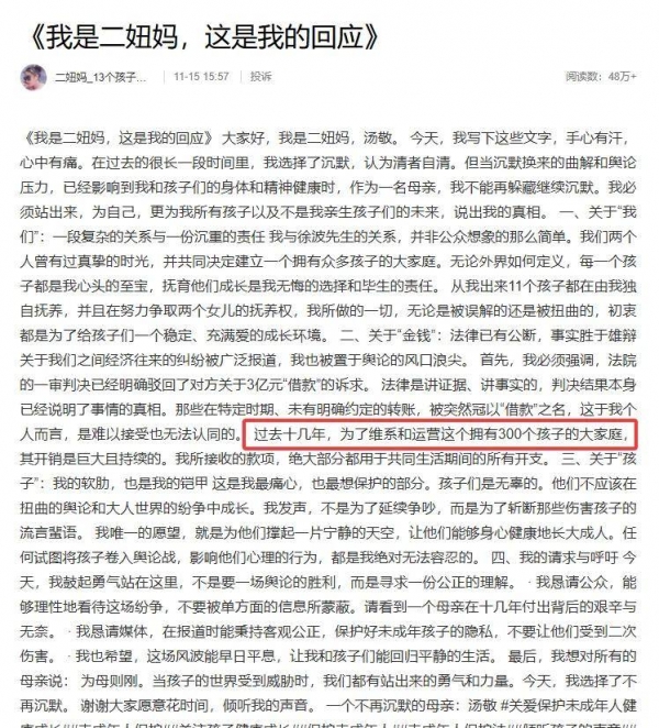汤敬透露,她曾在日本为徐波抚养13个孩子,其中包括2名自然生育的女儿和11个通过捐精代孕所生的子女,长期的特殊抚养生活和对这一规模化生育计划的无法认同,成为两人关系破裂的核心原因。