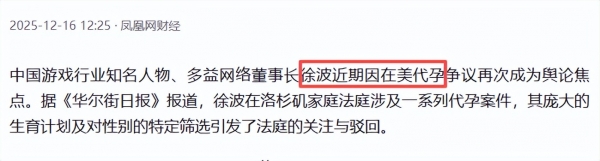 12月16日,凤凰网财经爆料一个商业奇才的大瓜,知名游戏行业大佬徐波,这些年不断在美国"代孕生子",熟练十分惊人。