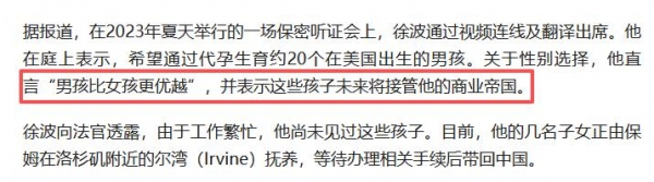 其公司社交媒体曾公开提及,徐波通过代孕已拥有超过100个孩子,这一数字远超他在法庭上提及的20个目标,显示出其家族王朝构建计划的规模远超外界最初认知。