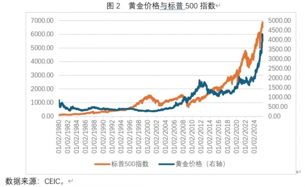 从理论上而言,黄金价格走势应该与利率走势负相关。一方面,在利率偏低时期,通胀预期较高,这会推动黄金价格上涨,反之则反是;另一方面,与利率下降相伴随的流动性宽松也可能推高黄金价格。然而如图3所示,在1980年至2000年期间,黄金价格走势与美国10年期国债价格走势的关系并不显著。在2000年至2020年期间,两者的关系大致呈现出负相关。但在最近几年内,两者的关系再度变得不显著。例如,在2020年下半年至2023年上半年期间,10年期美国国债利率显著上升(由0.5%上升至4%以上),但黄金价格整体上呈现盘整态势。又如,在2023年下半年至今,10年期美国国债利率整体上以盘整为主,但黄金价格却一路飙升。预计在未来一段时间内,美国长期利率走势不会成为影响黄金价格走势的主要因素。