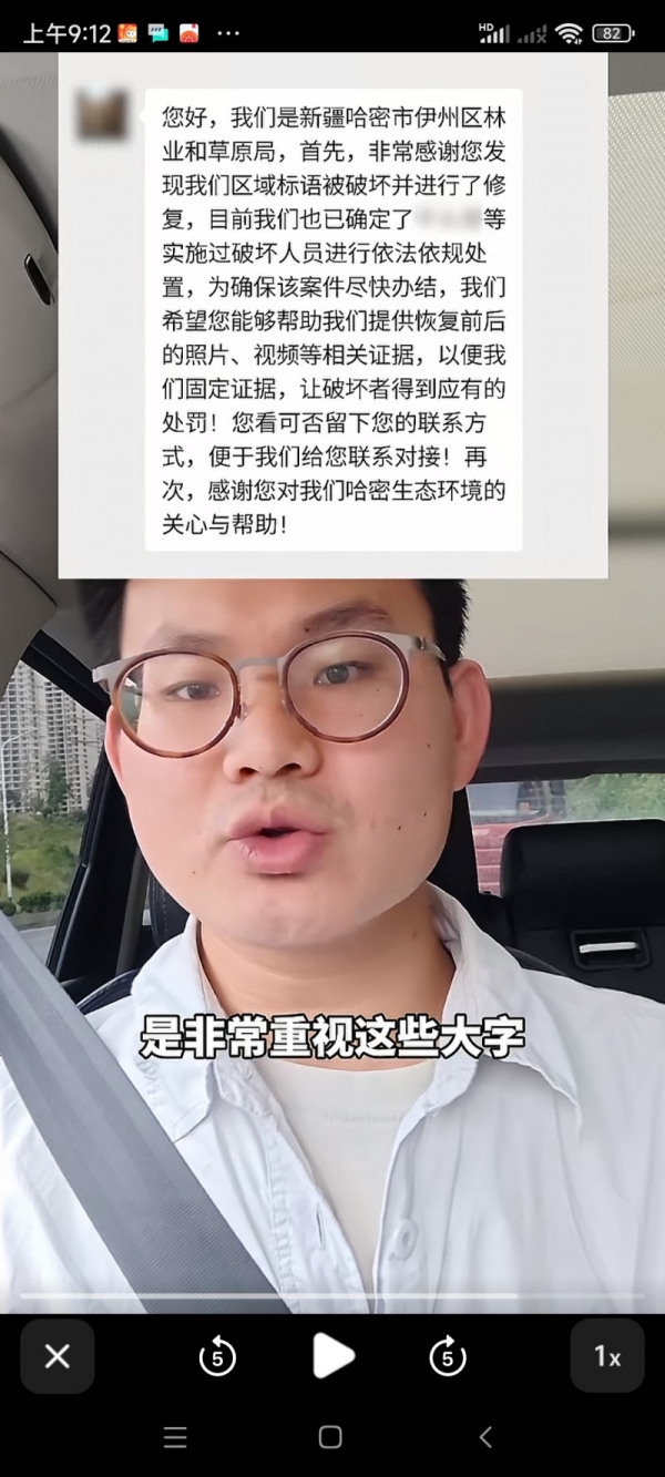 相关报道并没有透露肇事人员的具体身份,但有网友称,哈密当地一博主疑似参与其中。15日,上游新闻(报料邮箱baoliaosy@163.com)记者在某短视频平台看到,该博主在10月11日、12日连发两条视频为自己进行辩护,坚称自己没有搞破坏,反而还进行了修复。