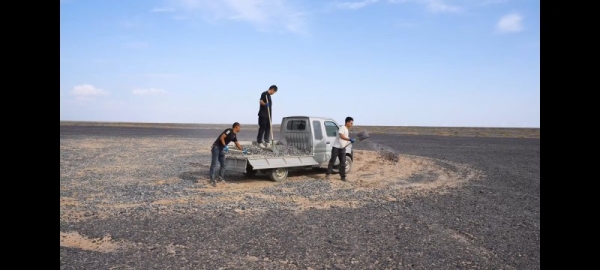 "陆二狗"告诉上游新闻记者,自己和朋友跑遍了哈密所有矿业公司和砂厂,寻找与戈壁相似的黑色砂石。最终,经过反复试验,他找来4名帮手花费一周时间,将一些越野车辆在"为人民服务"几个大字旁边漂移留下的车辙印和坑洼,用27车、重达20吨的砂石全部填平。