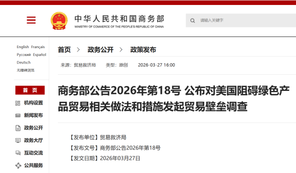 商务部公告2026年第18号 公布对美国阻碍绿色产品贸易相关做法和措施发起贸易壁垒调查