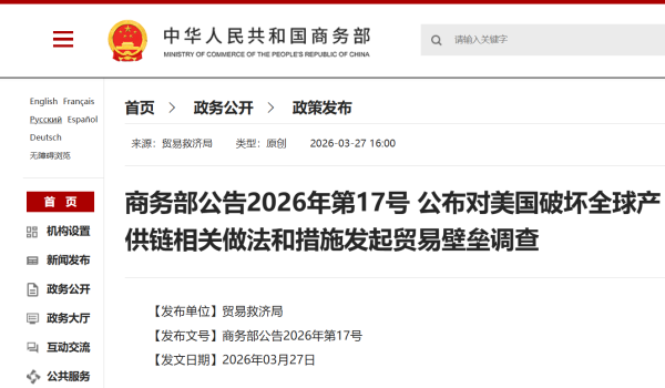商务部公告2026年第17号 公布对美国破坏全球产供链相关做法和措施发起贸易壁垒调查